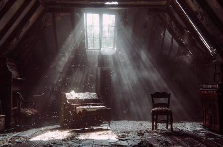 Elle a grimpé par l'échelle de meunier. Le grenier est petit et mansardé, pèle mêle sont entassés une grosse malle en bois, une commode à tiroirs et plusieurs vieilles chaises. Un cadre est accroché sur le mur le plus haut avec un dessin en noir et blanc. C'est la malle qui attire Augustine en premi...