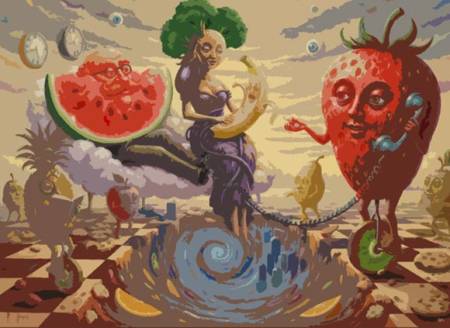 L'énorme écran-mur dans la cuisine-salon de Madame Fraise illumine rouge-vert-bleu, et une voix douce mécanique annonce « Appel de la Californie…accepter ou refuser ? » Sa fille la petite Framboise, rouge-rose-intense, saute de son pouf poire jaune, et appuie sur le gros bouton écarlate en criant « oui, oui, la Californie ! » Madame Fraise se fige ; ses yeux blancs, gros comme des soucoupes, semblent se fissurer ; des lignes grisâtres serpentent autour de ses pupilles. Ses akènes blancs tirant vers le jaunâtre défigurent sa peau d'une telle façon qu'elle n'a aucune envie de répondre. Cela et aussi le fait qu'elle ne connait personne en Californie sauf sa demi-sœur avec laquelle elle n'a pas parlé depuis quinze ans…et pour cause.